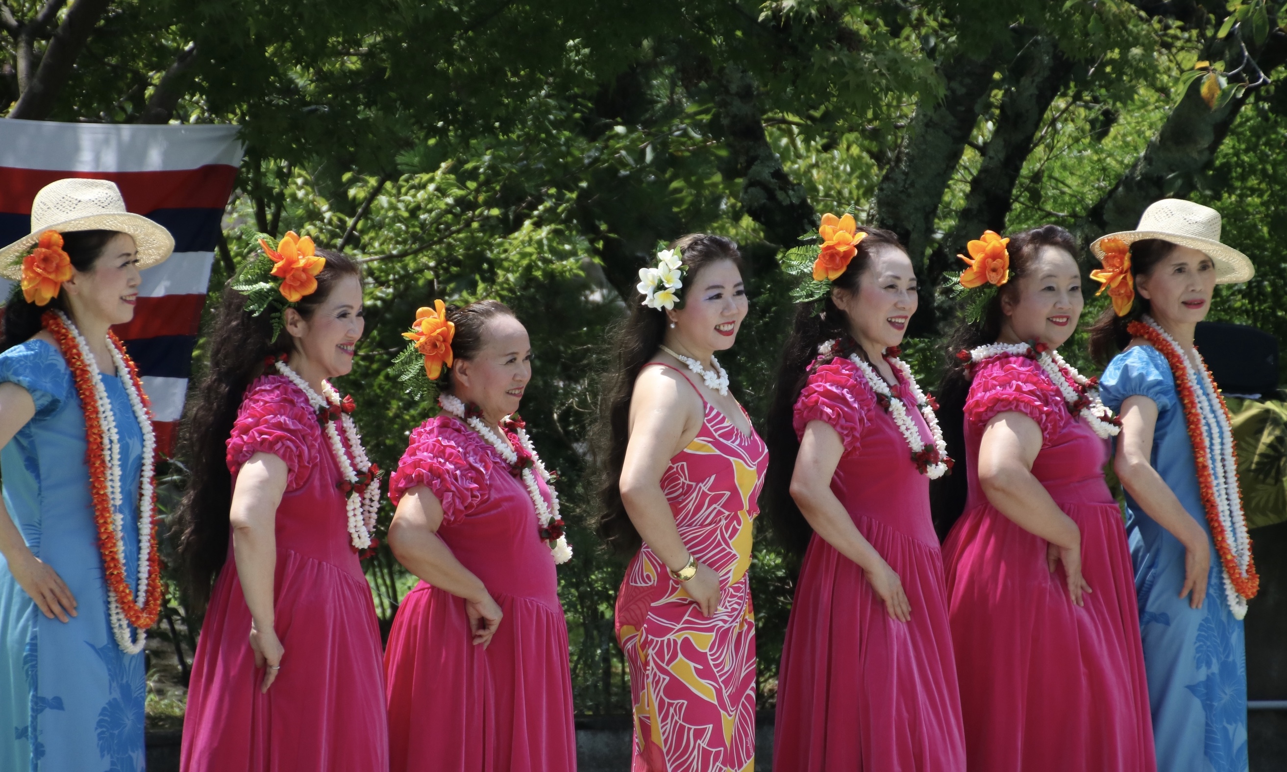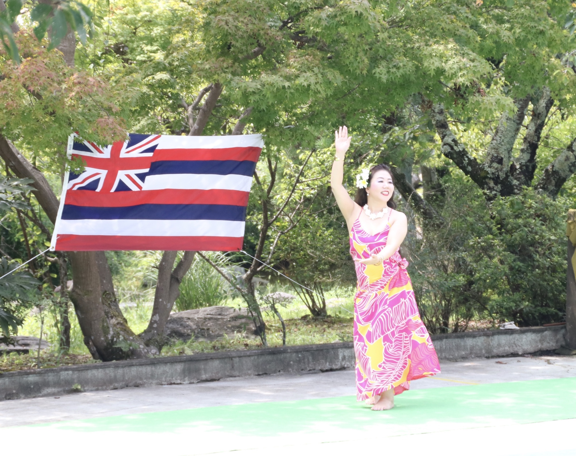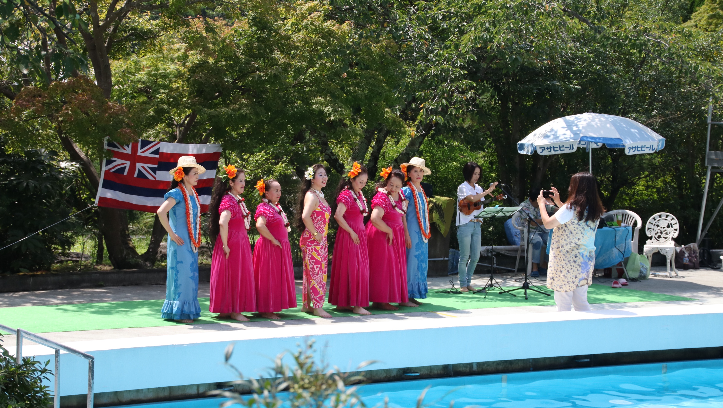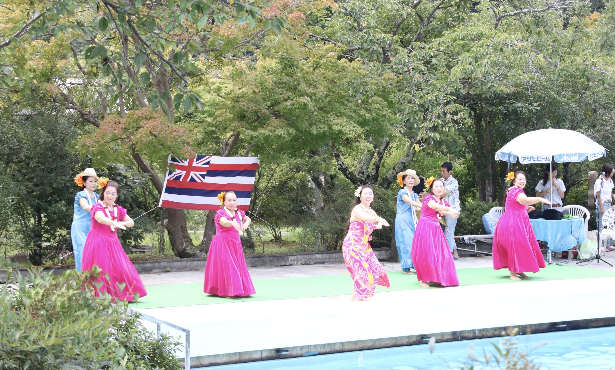 ちびっ子達が元気に遊ぶプールは水しぶきがキラキラ光ってホントに綺麗で、観客の皆さまもとってもリラックスしたムードでフラを楽しんで頂けたようで、踊っている私達まで気持ちの良いリゾート感たっぷりの最高のステージになりました。